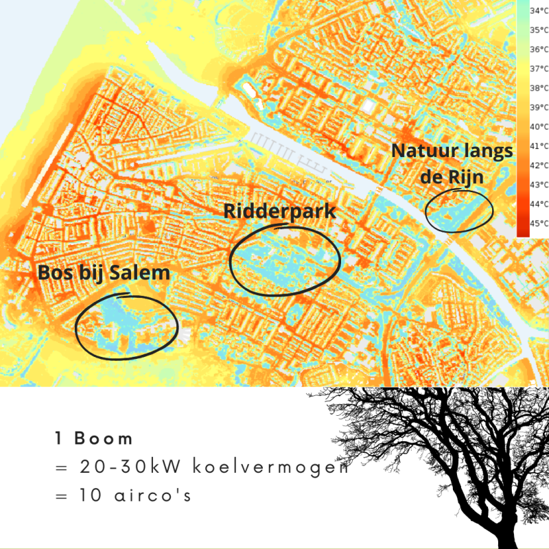 In tijden van droogte zorgen planten ervoor dat het water in de grond beter wordt vastgehouden. Daarnaast heeft een groene omgeving een verkoelend effect tijdens hittegolven. Zo kan één boom evenveel verkoeling geven als tien airco's! Zoals je op het kaartje hiernaast kunt zien is die groene verkoeling dringend nodig in Katwijk. Tijdens hittegolven loopt de gevoelstemperatuur in veel wijken op tot wel 45°C. Alleen op de groenste plekken in Katwijk (het bos bij Salem, het Ridderpark en de natuur langs de Rijn) blijft het koeler. Planten dempen dus de weersextremen en zorgen op die manier voor een leefbaarder Katwijk.