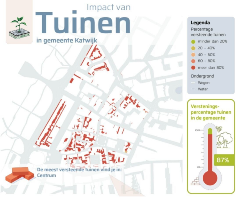 Waarom is het nodig dat Steenbreek Katwijk in actie komt? Gemeente Katwijk is één van de minst groene gemeente van Nederland. Alhoewel we in de gemeente Katwijk wel 2.469.131 m2 aan tuinoppervlakte hebben, is maar liefst 87% van de Katwijkse tuinen betegeld. Vooral in het centrum van Katwijk is er heel weinig groen. Niet iets om trots op te zijn.